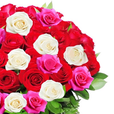 Diseño en florero de 50 rosas combinadas en tono fiusha. blanco rojo, follajes finos y moño. Altura aproximada 50 – 60 cm