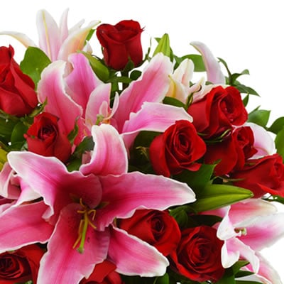 Diseño en florero con 5 stargazer, 12 rosas roja, follaje y moño. Altura aproximada 40 – 50 cm.